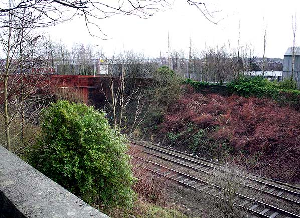 ![]() Looking towards the northwest at the east end of the site of Oldham Central station in January 2008. The down platform continued beyond the Clegg Street bridge, seen on the left. Interestingly the Oldham Clegg Street station platforms also stretched up to this point.