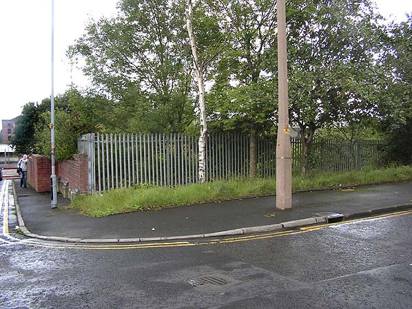 ![]() Looking south at the site of the Oldham Central street level entrance building August 2010. Close observation of the picture reveals that a small part of the building was still in situ at this date. To the left of the picture, next to the metal street lamp, can be seen sections of stone with blue engineering brick on top. This would have been the east side wall of the station builoding.