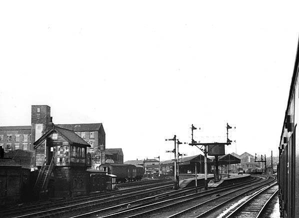 ![]() Oldham Mumps station looking north from a passing train in April 1954. The layout of the station is clearly shown in this picture. The station consisted of an island platform which had a bay at each end. One of those bays can be seen in this view. The extensive goods yard is seen to the right.