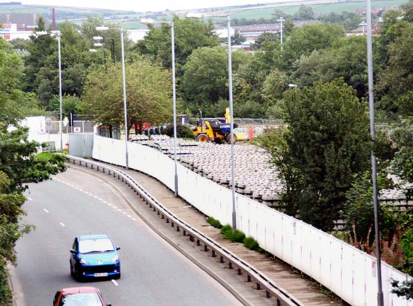 ![]() Looking east at the site of Oldham Mumps station in August 2010. Tramway sleepers had been stockpiled on the station site in readiness for the construction of a Metrolink tram route through Oldham. Photo by Bevan Price