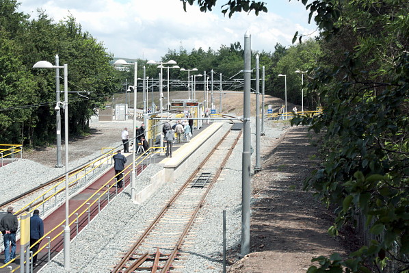![]() Looking north-east towards the site of Oldham Mumps station in June 2012. In the foreground, to the west of the station site, can be seen the temporary Oldham Mumps Metrolink Tram stop that had opened on 13 June 2012. A bus/tram interchange was under construction in the town centre which would ultimately replace the tempory stop seen in the picture. Photo by Bevan Price