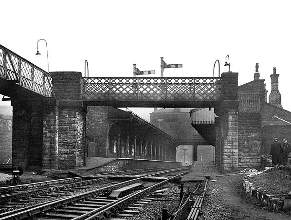 below but was supported between the two tracks by columns. Werneth had two platforms that stretched west from the station building. Steps led down to each platform. The station was also provided with an overall roof. An iron footbridge crossed the line at the west end of the station and served as an alternative access to passengers, as it had a link into Featherstall Road which crossed the line to the west of the station by an over-bridge.