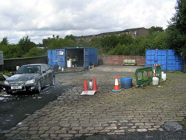 ![]() Looking north towards the site of Oldham Wernerth station's original main entrance in August 2010. The picture clearly illustrates the stone sett approach road that led from Railway Street up to the station entrance. The newer brickwork at the end of the road marks the site of the stations entrance building.