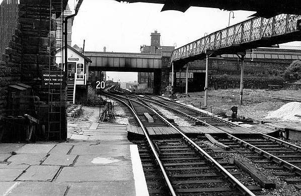 ![]() Looking west at the Oldham Wernerth junction taken from the west end of the up platform of Wernerth Station in June 1964. The junction and the signalbox that controlled it are clearly shown. The line leading off to the left is the Thorpes Bridge line along which most passenger trains had travelled after it opened in 1880. The line leading straight on was the original line to Oldham from Middleton. As can be seen in this picture it dropped down to Middleton very steeply. The incline having been originally worked by cables. The Middleton line closed in 1964. Part of the Werneth goods yard can be seen on the right.
