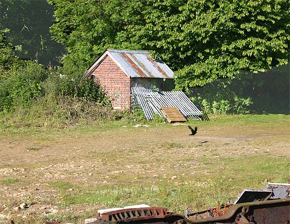 The only remaining part of Orton Waterville Station still extant in June 2006. This small brick building was probably the coal office. Photo by Nick Catford