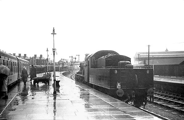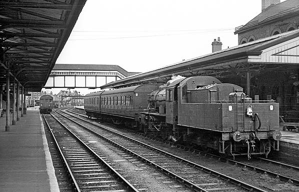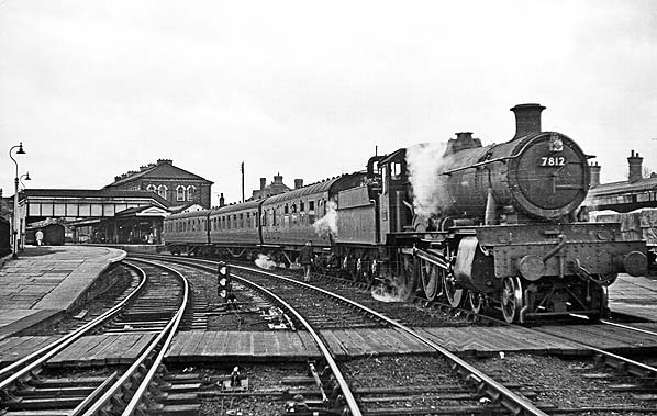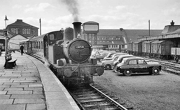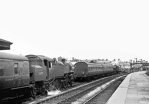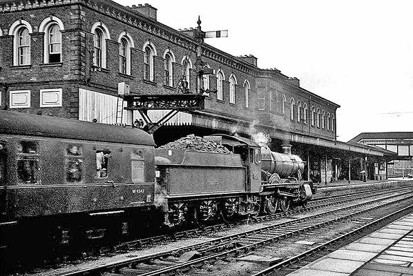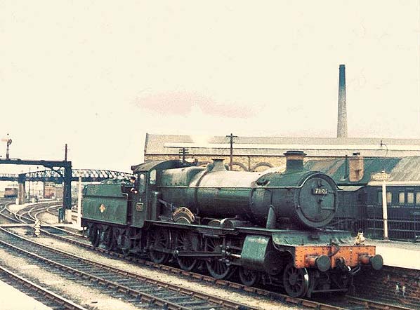 The north end of Oswestry station seen in 1963 as a 'Manor' class locomotive was passing through.