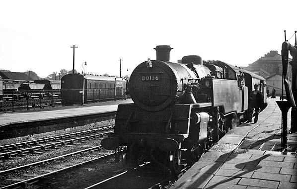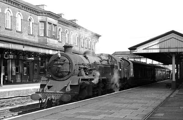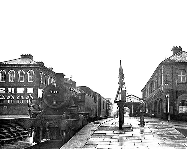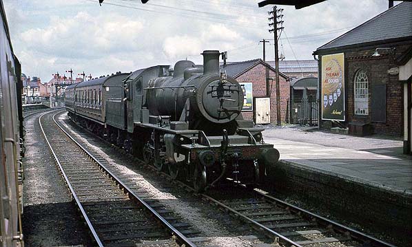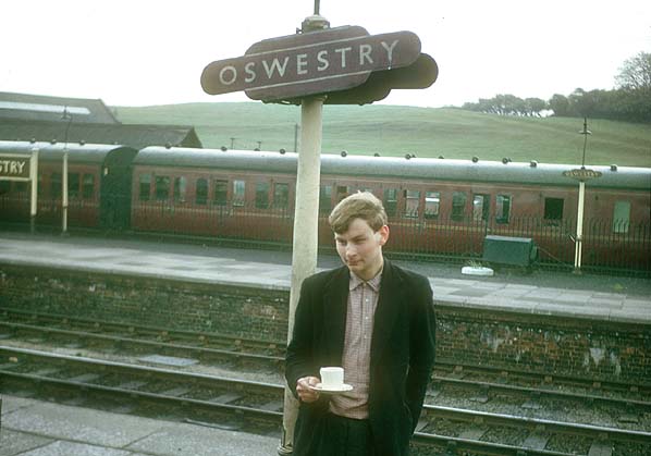 ![]() On 25 September 1963 British Railways 2-6-4T locomotive number 80136 is seen standing at the north end of the Oswestry station up platform having just taken on water. The engine was at the head of a Whitchurch train. Photo by John Ashley ![]() A Gobowen service is seen in the bay platform at Oswestry station in April 1964. Photo by Kenneth Gray ![]() One of the Oswestry station totem signs seen at the north end of the up platform in 1964. Photo from Phantasrail web site ![]() A Whitchurch to Welshpool passenger service is seen pulling into the down platform at Oswestry station on 22 June 1964. The view was taken from an Oswestry to Whitchurch train. Photo by David Christie from his Flickr photostream ![]() A busy scene at Oswestry in July 1964. Standing at the up platform are two trains. In the foreground is British Railways Class 4 2-6-4T locomotive number 80079 on an Oswestry to Whitchurch service. In the distance is an Ivatt Class 2 2-6-0 locomotive on a Gobowen service. Photo by Bevan Price ![]() An Aberystwyth passenger service is seen at the Oswestry station down platform on 11 August 1964. Photo by Alan Robinson Oswestry station looking south-west in November 1964 as ex-GWR 'Manor' class locomotive number 7812 'Erlestoke Manor' prepares to depart from the up platform on a Whitchurch service.Photo by David Pearson A local passenger service is seen standing at Oswestry station's down platform in November 1964.Photo by David Pearson ![]() Oswestry station looking north-east on a wet day in January 1965. A down passenger service prepares to take on water. At the head of the train is ex-LMS Ivatt 2MT class 2-6-2T locomotive number 41241. Photo by Bevan Price A rail tour is seen passing north through Oswestry on 17 January 1965.![]() On a wet day in February 1965 passengers make their way to a Gobowen service formed of a two coach DMU. To the right a loght engine is seen waiting for a signal to allow it to proceed northwards. Oswestry had lost its through passenger services in the January of that year and only the Gobowen service remained. Photo by Bevan Price Home