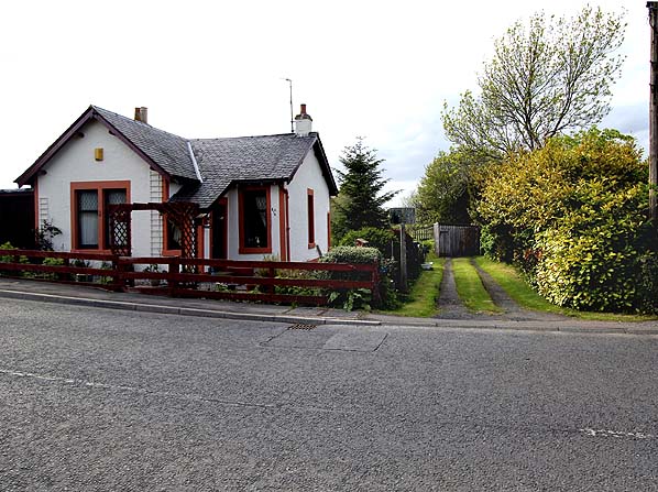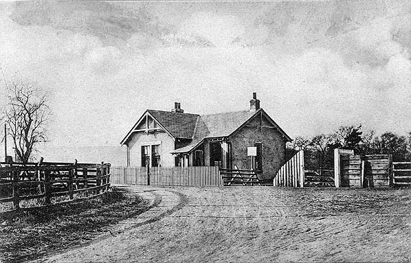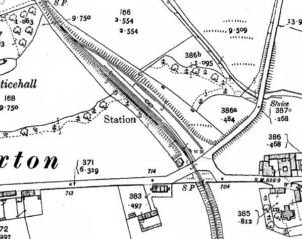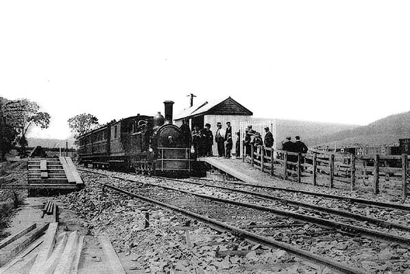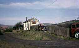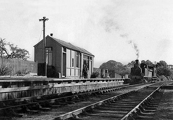 There was a small goods yard accessed from the north, with one siding serving a wide cattle dock behind the down platform. A weighbridge and office stood at the entrance to the yard adjacent to the level crossing. No yard crane is listed in 1904, but apparently a crane was provided later. There was no signal box, points being controlled by single-lever ground frames, one at the entrance to the goods yard and one at either end of the loop. Although a grounded |