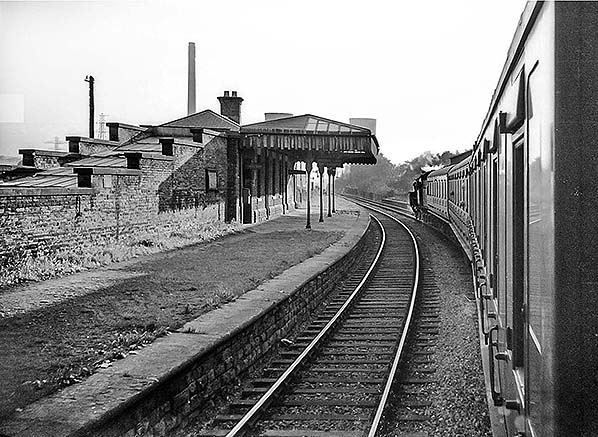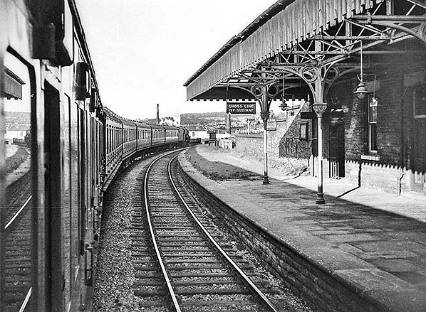 Photo by Geoffrey Robinson from John Robinson's Steaming North Last days of the North East Lancs Loop Line collection ![]() An excursion passenger train heads out of the station circa 1962. The engine (most likely a black 5) is about to cross the bridge over Station Road. Out of sight because of the carriages was Padiham signal box which was situated on the Rose Grove end of the down platform. On the up platform, the sign “CROSS LINE BY SUBWAY” can clearly be read, and at the Rose Grove end of the platform, the large wooden LMS Hawkseye sign lies at the very end near the Station Road bridge. This train is going east towards the 1 in 40 bank up to Rose Grove.