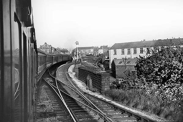 Photo by Geoffrey Robinson from John Robinson's Steaming North Last days of the North East Lancs Loop Line collection ![]() Just beyond the station, the excursion train heads towards Padiham itself over two bridges. The first (stone bridge) carries the line over a weir that runs off the river Calder. On the left at this point was one of the original signal boxes (Padiham East) which was removed in 1913. The crossover and track running right off the main line ran into the goods yard and refuge siding. The second bridge, where the engine has got to, is over Green Lane. The train itself is heading east towards Rose Grove.