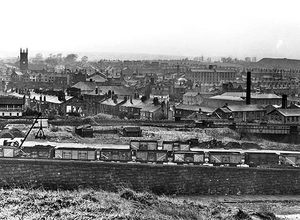 ![]() Padiham goods yard c1963. Coal wagons sit on the coal sidings nearest to the yard's outer wall. A mobile crane with a grab unloads coal from the wagons, and piles of coal can be seen next to a siding. The original crane was a Goliath crane but was removed in 1953. To the left Padiham signal box can be seen as can (on the right) Station Road bridge which carried the main running lines into the station.