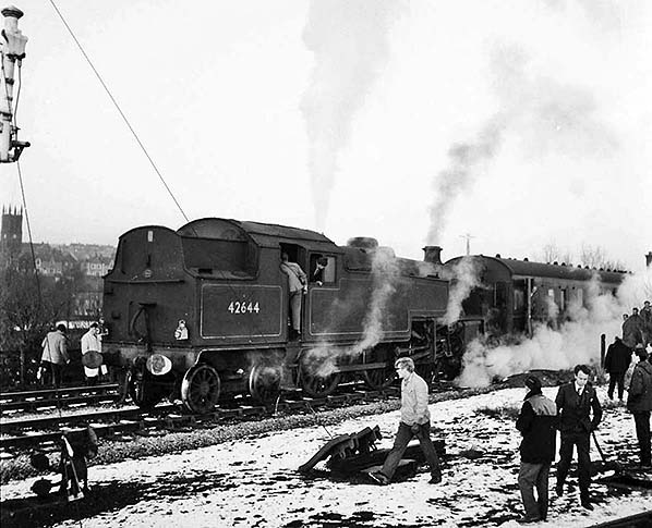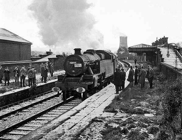 Photo ftom John Mann collection ![]() The Locomotive Club of Great Britain The Rossendale Forester rail tour stands at Padiham station on a cold frosty and snowy day 3 December 1966. A few enthusiasts gather on both platforms to take pictures. On the right is the down (eastbound) platform and on the left the up one. The photo was taken from the Rose Grove eastern end of the down platform. The two cooling towers of the power station can be seen in the distance. By this date the down line had been cut back to just beyond the platform area on the western end, and the up line (although closed) west of Padiham was still extant all the way along the loop line. The engine is 42644 a class 4P 2-6-4 tank engine which has just come up from the power station.