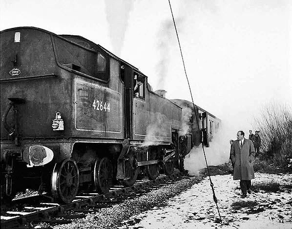 Copyright photo from the Burnley Civic Trust Heritage Image Collection ![]() Another view of 4P-E 42644 pulling carriages of the LCGB The Rossendale Forester rail tour on 3 December 1966. The tourt ran from Manchester Victoria with 42644 hauling the legs from Clifton Junction to Accrington South Junction and Church and Oswaldtwistle to Manchester Victoria. The tour tour coincided with the passenger closure of Rawtenstall-Bacup and Ramsbottom-Accrington services and had been arranged at fairly short notice. The location seen here is just beyond the western end of the platforms at Padiham next to the goods yard entrance. The enthusiasts walk around the location taking in the atmosphere.