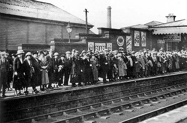 Photo from John Mann collection ![]() A large number of people gather on the up platform for an excursion, most likely to Blackpool, taken in summer time in the 1920's. A sign reminding people only to cross the line by subway is clearly readable, and in front a ‘Way Out’ sign is fixed to the building's wall. There was usually plenty of advertising at stations and Padiham was no exception. You can see for instance adverts for Pear's soap as well as others.