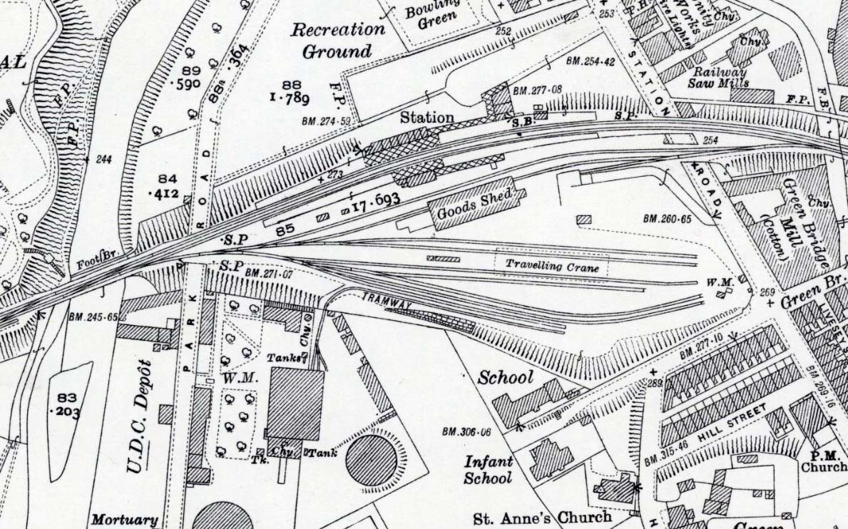![]() 1931 1:2500 OS map. The goods yard layout remains the same as the 1893 map, however the short third coal siding has been made into 2 longer sidings. The tramway that runs alongside the outer one runs all the way and directly connects the yard with the gas works. The 2 original signal boxes have been replaced by 1 box situated of the down platform at the Rose Grove end - this replacement happened in 1913. Just out of sight to the left, Padiham's power station was now built and in use. Trains for it would cross over the river bridge (on the left) and immediately run off the main lines to their left (or South as we look at the map)