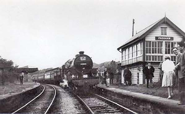 ![]() 22 September 1962, the RCTS Mid Lancs Railtour 1X23 pulled by a Hughes Crab 42844 stands at Padiham's down platform on 22 September 1962. People alight from the train and have a wonder around the station, a few have made it onto the up platform on the left. On the right, Padiham signal box stands on the Rose Grove end of the down platform. The platforms are getting overgrown by this date. Photofrom John Mann collection