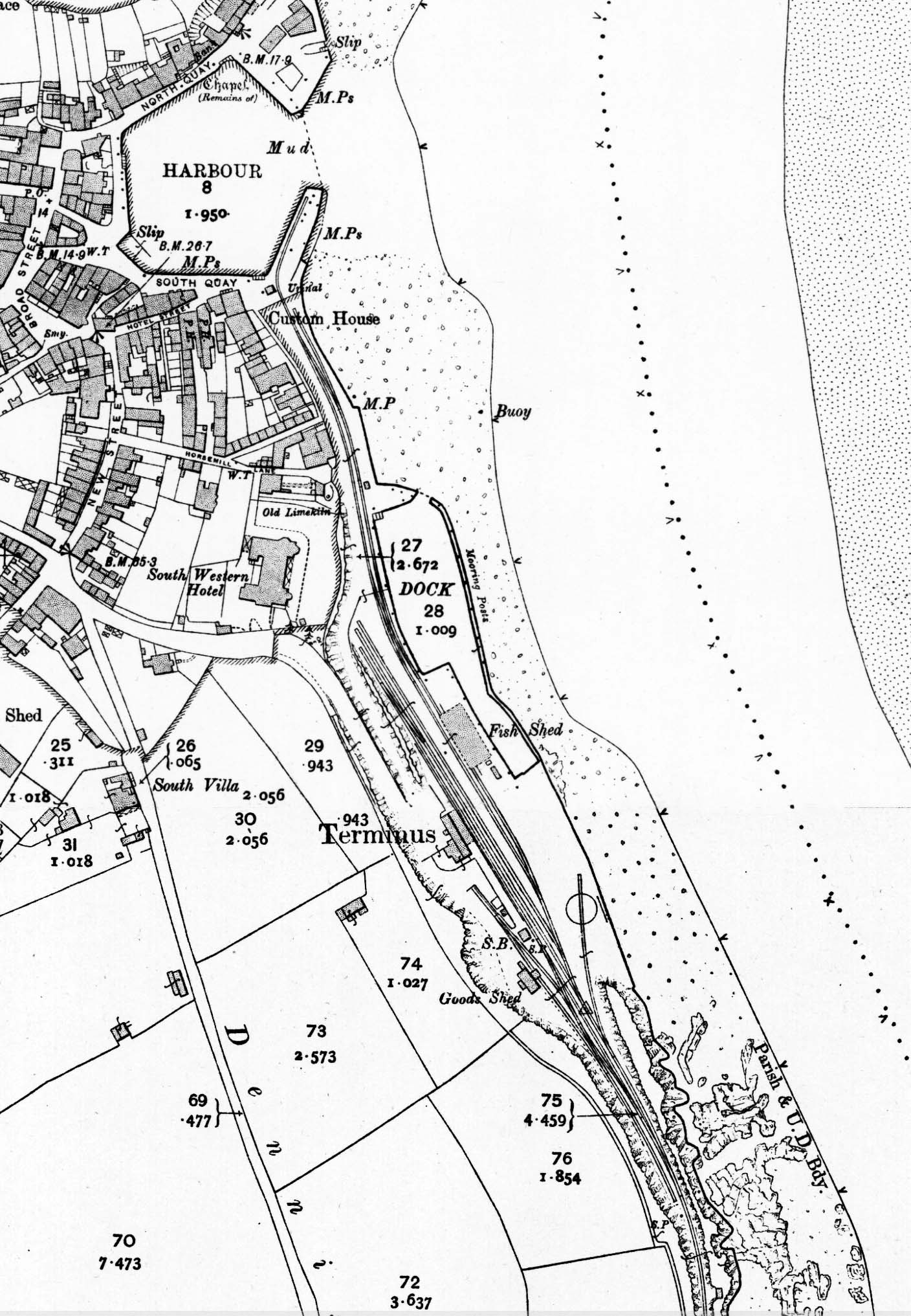 ![]() 1905 1:2,500 OS map of the railway and harbour areas of Padstow. With the exception of the siding loop avoiding the goods shed, removed in 1933, the track in the goods yard and station area (shown as 'Terminus') is of much the same layout as it was until just prior to closure. On the seaward side the original turntable road is shown. This was altered in 1933 together with the pointwork at its southern end. Visible just above the fish shed are the mooring posts; this was the approximate site of the later railway jetty. Moving northwards we can see the tracks curving round towards the harbour and South Quay. Two tracks run as far as the Custom House with one continuing onto the harbour wall. The small goods yard is to the west of the passenger platform and comprises a single siding running beneath the goods shed canopy and terminating alongside a small dock at the rear of the passenger platform; a loop runs round the goods shed. Cattle pens are located on the dock. The signal box (SB) is seen at the south end of the platform and the small building on the platform ramp is the lamp room. Just to the north-west of the station the South Western Hotel is shown. Some confusion exists over this hotel, now the Metropole. The name ‘South Western Hotel ‘implies it may have begun life as a railway hotel but it would seem this was not the case. The Metropole Hotel's own website states it was built between 1900 and 1904 for ship owners John Cory & Sons, the implication being that it was nothing to do with the railway but it should be remembered that initially the LSWR only worked the line; it did not own it until 1922. The hotel's website does not, at the time of writing, make any reference to the name 'South Western Hotel'. A number of period photographs and postcards do, however, refer to it by that name. Quite when the Metropole name was assumed is unclear. It was sold to Trust House in 1936 and requisitioned by the Admiralty during the Second World War.