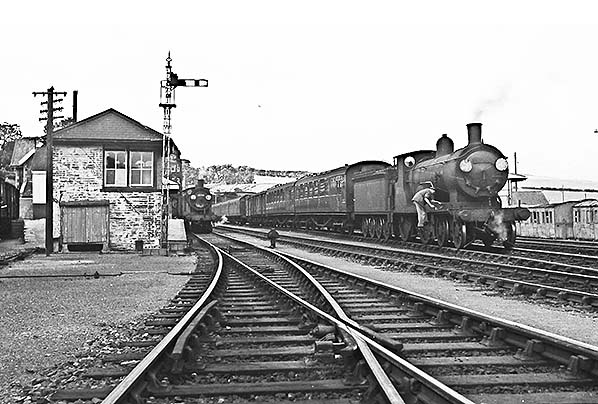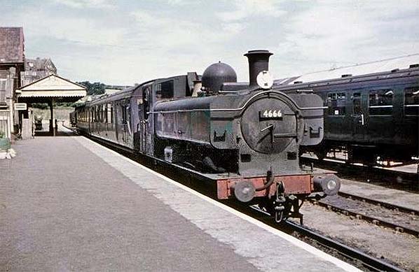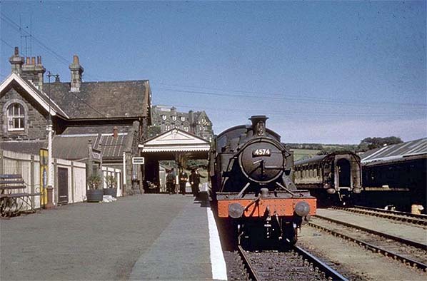 ![]() Sometime in the early 1960s ex-GWR Churchward 'Small Prairie' No.4574 waits at Padstow with a service most probably to Bodmin Road. 'Prairie' refers to the 2-6-2 wheel arrangement and the GWR had what were known as 'Small' and 'Large' Prairie tanks, with several detail differences within the types. No.4574 was the final member of what was commonly known as the '4500 Class' and dated from 1924, the type being introduced in 1906. The '4575 Class' which followed was a development built under the auspices of Charles Collett from 1927. At this point it is worth reminding readers that the Great Western Railway dated from 1833 and was the only major British railway company to be unaffected by the 1923 Grouping. At Padstow, No.4574 is, if the shadow is to be relied upon, in charge of a single coach train which appears to be in either crimson or maroon livery. This suggests an ex-GWR vehicle and most likely a brake composite. Stabled on the right is a BR Mk1 coach in Southern Region green livery and it appears to be fitted with a roofboard, most probably for the ‘Atlantic Coast Express’. Padstow is best known for having been a Southern outpost and thus it is easy to forget that even prior to the takeover by the Western Region a number of WR trains also served the line owing to the Bodmin Road - Bodmin General section being GWR territory. Following nationalisation, typically the WR services would be Bodmin Road (now Bodmin Parkway) to Wadebridge or through to Padstow entailing a reversal at Bodmin General. It was not unknown for some 'mixed bag' workings to occur, for example stock or locomotives from one region working a service belonging to another. Note, on the platform, the repainted lamp standard. Compare this to the standard at the far end of the platform as seen in the picture showing the Class 122 diesel railcar. The former gas lighting at Padstow had been supplied from St Columb gasworks, located some distance away, its owning company being the St Columb & Padstow Gas Co. The works closed in 1955. Of No.4574, she was shedded at Newton Abbot and then Laira (Plymouth) around the time the photograph was taken, being withdrawn from the latter in March 1963. Unlike three of her sisters, she did not survive into preservation being instead scrapped at Cashmore's, Newport, the following year.