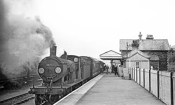 Photo by David Pearson ![]() Photographed on the same day as No.30313, 6 July 1961, here is class sister No.30717 having just arrived at Padstow with a Maunsell 2-car set. A few passengers have alighted but there would appear to be no call for the platform barrows. Having finished attempting to produce smoked fish No.30717 will uncouple, draw forward and then reverse along the release road on the left. She will then proceed to the turntable. Padstow turntable, the second installation, was vacuum operated, being connected to a locomotive's vacuum pipe via a connection provided, usually, at each end of the turntable. No.30717 was an Exmouth Junction locomotive. She was withdrawn shortly after this photograph was taken, as was No.30313, after a life of almost 62 years.