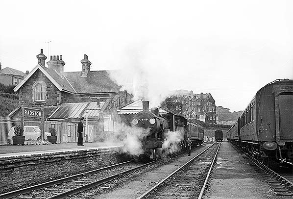 Photo by G Parr ![]() Padstow on 6 July 1961 as Drummond T9 No.30313 attempts unsuccessfully to hide from the camera behind clouds of steam. She will take her train, a 2-car Maunsell set, to Wadebridge and then on towards Launceston. She carries a 72A (Exmouth Junction) shedplate as might be expected and was withdrawn from that shed in July 1961. At the end of the release road stands a single Maunsell coach, with another in the right foreground and beyond which stands a Bulleid set. Behind the railings on the left a Mini van is parked.