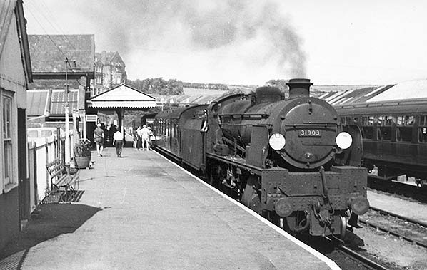 Photo from Malcolm McCarthy collection ![]() During the World Wars U-boats lurked off the Atlantic coast but here is a U-boat at Padstow station. U-boat was the nickname given to Maunsell's U1 3-cylinder class 2-6-0s which were recognisable by the 'slab' section above the bufferbeam which housed the third cylinder. Some, if not all, began life without smoke deflectors and in this form their appearance was rather peculiar. Some of the U1 class were rebuilds of the unstable and frankly dangerous K, or 'River' class 2-6-4T's which had been involved in a number of derailments, the most serious of which occurred at Sevenoaks in 1927 resulting in 13 deaths and 40 injuries. No.31903 was not one of the River class rebuilds. One, BR No.31806, has survived into preservation. It had begun life as K class No.806 'River Torridge'. Of U1 No.31903 she was allocated to Exmouth Junction, the shedplate for which can just be seen above, only for a short period from May to October 1961 so the photograph will date from that period. The entire class had gone by 1963, No.31903 going in December 1962 by which time she was at Norwood Junction. Her train at Padstow is an unidentified Maunsell set while on the right is stabled some Bulleid stock, that visible being of a later design with deeper window ventilators. It must have been a warm day at Padstow as shorts and/or shirt sleeves predominate.