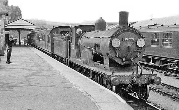 ![]() ![]() The Drummond T9 class has been described elsewhere so needs no elaboration here. This view of No.30729 can be dated between May 1960 when she was sent to Exmouth Junction shed and March 1961 when she was withdrawn. She is heading a train for the Halwill route. The train is set 24 which comprised Brake Third - Composite - Brake Third, all being Maunsell corridor types. It is interesting to note that third class had been abolished in 1956 and reclassified second class, yet terms like 'Brake Third' appear to have remained in use within the rail industry for some time afterwards and most probably out of tradition. On the right is a Bulleid corridor coach in green livery with stripe. It is one of the later types with deeper window ventilators and was most likely part of a set.