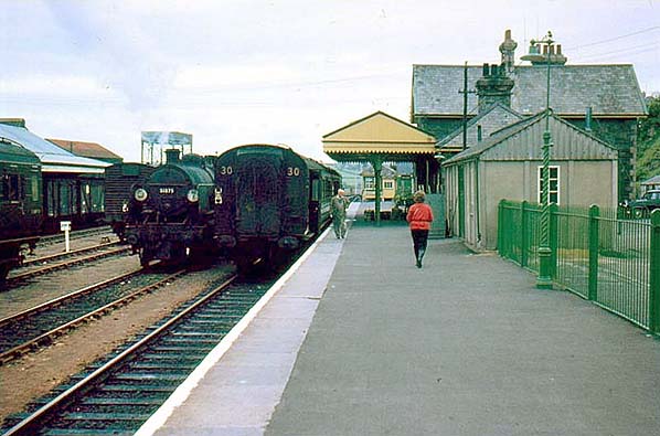 An un-rebuilt Bulleid Pacific, with a full head of steam, prepares to depart Padstow with the Atlantic Coast Express (ACE). Under magnification, the carriage roofboard is readable and confirms the train's identity. The photographer is certain this train was the final ACE departure from Padstow, in which case the date will be 5 September 1964. Locomotive No.34023 'Blackmoor Vale' was in charge but did not work through to Waterloo. The train was formed of Bulleid set No.474. This was an 8-car set and this would seem unusual at Padstow as the ACE was formed of portions which divided in the down direction and joined in the up. However, arrangements varied over time and according to time of year and by the time the final ACE departed Padstow other sections had already been withdrawn so an 8-set on the final departure from Padstow would not be quite so surprising. One curiosity is the ACE's name. Locomotive headboards were worded 'Atlantic Coast Express' but carriage roofboards, or at least that in the above view, were worded ‘The Atlantic Coast Express’. The people on the platform are presumably seeing off friends or relatives. The first carriage is of Bulleid design and one of the earlier examples with shallower ventilation lights. By this date Padstow jumped to the cracking whip of BR's Western Region but, as here, a number of Southern Region trains continued to operate. The signal box has long since abandoned the advertising of Lux soap flakes while at far right the loftier electric lamp can be seen. Note the footwear, sandals of a typical period style predominate. 'Blackmoor Vale' went on to see the end of steam on the Southern Region and was withdrawn in July 1967. She is now preserved.