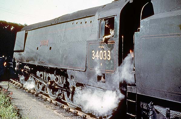 Un-rebuilt Bulleid West Country class No.34033 ‘Chard’ 'on the stops' at Padstow in July 1964, probably in the process of being released from an incoming train. 'Chard' was another of the class to run around minus crest but, unlike in the picture of 'Westward Ho', the small plate bearing the class name is rather more visible. Also clearly visible in this view are the unusual Bulleid-Firth-Brown, or 'Boxpox', wheels. Normal for Bulleid's steam locomotives, these wheels also appeared on certain of the Southern's diesel locomotives and in particular the diesel shunters of what became BR Class 12. No.34033 began life in 1946 and was originally numbered in Bulleid's peculiar system as No. 21C133. Pacific locomotives have a 4-6-2 wheel arrangement but the Bulleid scheme interpreted this by number of axles, thus 21C meant two leading bogie axles plus one trailing axle with C representing the three coupled driving axles. The rest of the number, i.e. 133, was the actual locomotive number. On the cabside above the number '7P 5FA' can be seen. This was a quite standard system signifying that the locomotive could work Class 7 passenger and Class 5 goods trains. The 'A' was an indication of the type of goods train permitted, specifically with regard to braking. As any enginemen would confirm, starting a train moving is one thing but stopping it again is another matter entirely. The triangle below the number signified route availability and broadly speaking this centred around axle loading, i.e. the weight carried by each axle and thus the weight borne by the track. This stipulation was the responsibility of the civil engineer. These symbols varied in both colour and shape, something which becomes clear when studying photographs, and could differ on locomotives of the same class. The reason for the latter in respect of the Bulleid Pacifics in unclear but seems to have been connected with the possibility of the class operating onto Western Region metals. No.34033 was one of the class never to be rebuilt. At the time of the above photograph 'Chard' is believed to have been allocated to Plymouth Friary. She was transferred to Eastleigh shortly after the photograph was taken and withdrawn in December of the following year.