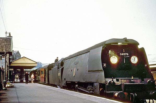A typical scene at Padstow in August 1963 as a local train awaits departure for Exeter Central. The fireman is perched on the tender, presumably moving coal forward. The Bulleid Light Pacifics comprised the ‘West Country’ and ‘Battle of Britain’ classes, the two essentially differing only in name. Whilst one may think the ‘West Country’ class would be found in the area of its name, which indeed it was, the ‘Battle of Britai’n class also appeared. Above is 'Spam Can' No.34079 '141 Squadron' which at the time was based at Exmouth Junction shed. Below the nameplate the Squadron's crest can be seen. The motto of 141 Squadron was 'We Slay By Night'. No.34079 was to outlive the squadron it was named after by two years, being withdrawn from Eastleigh in February 1966. The train is one of the Southern's 3-car sets used in the area. The set number is barely visible but an enlargement of the original photograph suggests it is No.190. The history of the Bulleid Pacifics is complex, as was anything to do with Bulleid, and can be read here here