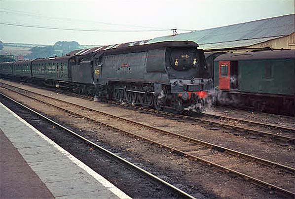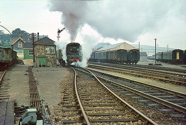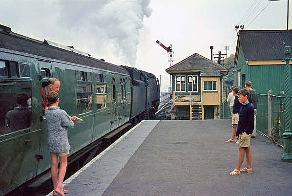 Un-rebuilt Bulleid Pacific No.34023 'Blackmoor Vale' waits in the carriage siding at Padstow with the stock of the final ‘Atlantic Coast Express’ for Waterloo in September 1964. The stock was Bulleid 8-set No.474. The train will draw forward beyond the signal box and reverse into the platform. Although carriage roofboards were in position, the locomotive did not carry the ACE headboard - or at least not from Padstow. It has been suggested that on Saturdays the train was not officially named although this seems a little odd, partly because of the carriage roofboards and partly because Saturday was the one day the train was likely to be busy. Holidays in those days almost always ran from Saturday to Saturday. In the early 21st century some outfit called First Great Western decided to use the ‘Atlantic Coast Express’ name for a through service from Paddington to Newquay using an HST set. However, the days of the romance of named trains have long gone and sitting in an HST, as technically excellent as these trains are, surrounded by plastic, irritating announcements and polystyrene tea cups while trying to convince oneself that one is on board the ACE is simply laughable. But at least Newquay is on the coast of the Atlantic; not every destination of the proper ACE could claim this.