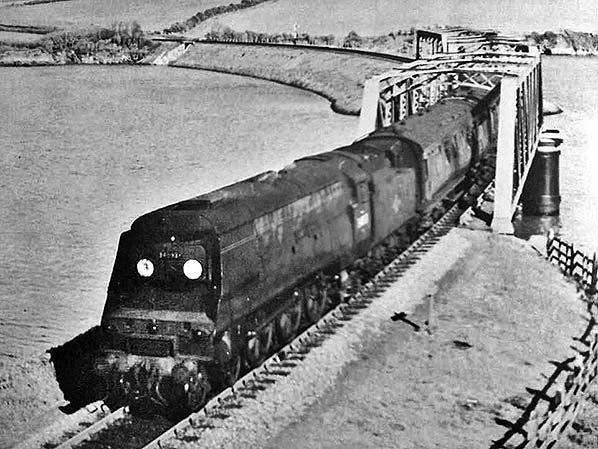 An un-rebuilt Bulleid Pacific crosses Little Petherick Creek bridge with a short train on its approach to Padstow. It is some ¾mile from the terminus. The locomotive is difficult to identify. The smokebox numberplate is 340?3 but we are helped by the locomotive having one of the shorter names. It is therefore likely to be West Country Class No.34033 'Chard' (also pictured into the 1960s) was at Plymouth Friary. The tender carries the second version of the British Railways logo which, assuming the identity to be correct, would date the picture to the time 'Chard' was at Plymouth Friary shed. This was the former Southern shed at Plymouth and would have had a few workings onto the North Cornwall line. The coaching stock is similarly difficult to identify. The first vehicle has split stepboards, a feature found on certain of the Maunsell stock. The second vehicle, barely visible, has a body profile suggestive of Bulleid stock. The bridge has been described elsewhere but this view offers a closer look at the cylinders which form the piers. These were driven down to bedrock well below the river bed. This view also offers a rare glimpse of the underbridge at the eastern end of the embankment. Midway along the embankment stands a signal. The train will have passed the signal only seconds previously yet the signal is already in the 'On' position. This might suggest that the signal was Padstow Outer Distant but it is too far from the camera for a positive identification. There were no intermediate signal boxes on the Padstow - Wadebridge section, the route being under the control of Padstow and