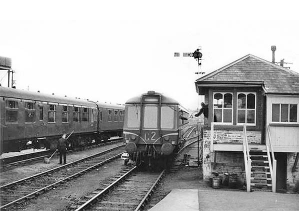 A Gloucester single-unit railcar, later Class 122, arrives at Padstow. The brake end of the railcar is facing the camera. The period will be after 1963 but probably no later than 1965 as the sidings are still in situ. Earlier DMUs (and some railbuses) built in the 1954-58 period originally lacked 'speed whiskers', these being applied retrospectively. Generally from 1958 onwards this device was applied from new. 'Speed whiskers' is a term which seems to have originated with the railway enthusiast fraternity but the original purpose was partly aesthetics but mainly as a warning device. Staff, especially track workers, were used to the sound of an approaching steam locomotive which, under certain conditions, could be heard approaching from several miles away. Apart from the characteristic 'rasp' when accelerating, diesel multiple units were relatively quiet and their approach was not always obvious. Whether this hazard was perceived or the result or 'near-miss' incidents is not known but no such device was ever deemed necessary on electric multiple units until, following various experiments, yellow warning panels appeared. The latter replaced 'speed whiskers' on DMUs from circa 1964 onwards. Some confusion can arise with Class 122 and the similar, but not identical, Class 121. The former was introduced in 1958 and the latter in 1960 yet when class numbers were introduced the newer units, Class 121, took the lower number suggesting they were older. The procedure seen in this view was rarely photographed at Padstow. The driver is handing the single line token for the section from Wadebridge to the signalman. In this case, as was common elsewhere, the token is in a pouch attached to a large hoop to facilitate exchange with a moving train. For departing trains in situations such as at Padstow where the signal box was on, or at the end of, the platform, the token would usually be handed to the driver just prior to departure. If any sidings existed within a section then the token system was more complex, involving what was known as, to use a loose term, the 'key [or ticket] attached to train staff' system. Following abolition of Padstow signal box and until closure, the 'key attached to train staff' system was used for unlocking the points at the south end of the runround loop, a ground frame having been installed for the purpose. The points at the north end had never been operated from the signal box and had their own local lever. The key was used by the very last train as the locomotive, a North British Class 22 diesel, was required to run round its train of ex-GWR coaches. The railcar is passing one the Westinghouse ground signals of the style peculiar to the Southern. On the left some BR MkI coaches can be seen. They appear to lack lining, which would suggest they are in Southern Region green livery. They may or may not have been ACE stock but if so the date can be further pinned down to the 1963-64 period. The stripe, which was yellow, below the cantrail on part of the nearest vehicle indicated the first class section. The worker on the track has what appears to be a mop and bucket, so no doubt the carriages are receiving a wash. At some locations, where mechanical washing plant was not provided, a water-broom was used but even this basic provision does not appear to have been installed at Padstow.