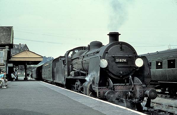 'Mongoliper' N class 2-6-0 No.31874 waits at Padstow with a train for Exeter Central via Halwill. The train comprises a Bulleid corridor composite and two Maunsell vehicles. Another Maunsell vehicle can be seen stabled on the right. No.31874 had spent a number of periods at Exmouth Junction shed, the last being between February 1961 and its withdrawal from service in March 1964. The tender carries the second BR logo; this and the green coaching stock suggests that the photograph dates from this period. It is probably summertime if the people are anything to go by, especially the young man and his clothing on the extreme left.