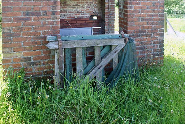 The original Pant Glas station entrance gate seen against the lever frame hut on 25 May 2012. Photo by Paul Wright