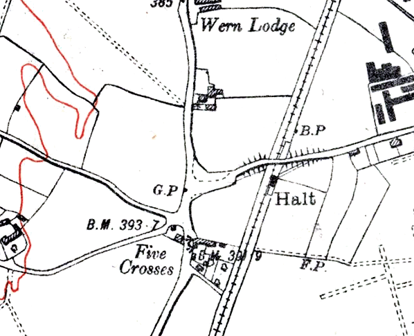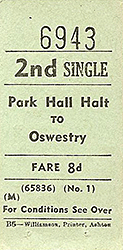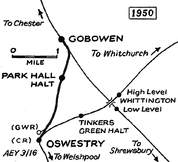 Notes: Park Hall Halt was located on the 2½-mile Gobowen – Oswestry branch of the Great Western Railway (GWR) which was originally opened by the Shrewsbury & Chester Railway (S&CR) on 23 December 1848. The branch connected to the S&CR main line that linked Shrewsbury and Chester and which following take-over by the GWR on 1 September 1854 became part of a major trunk route between the Midlands and the River Mersey at Birkenhead. At the time of opening there were no intermediate stations on the branch.