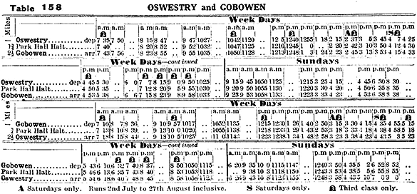 The BR[WR] timetable for the summer of 1949 (shown above) showed 21 trains to Gobowen and 25 to Oswestry on Monday-to-Friday. On Saturday there were two extra trains in each direction and there were ten trains each way on Sunday. The winter timetable published on 15 September 1958 showed 23 trains in each direction on Monday-to-Saturday. On Sunday there were six trains to Gobowen and seven to Oswestry. A further five services in each direction were shown in the timetable but they were by buses of the Crosville Motor Company.