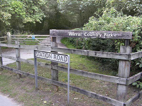 ![]() Looking towards the station approach road in August 2009 showing two signs that show two aspects of the lines history. Its former use as a railway and its present use as a counttry park.