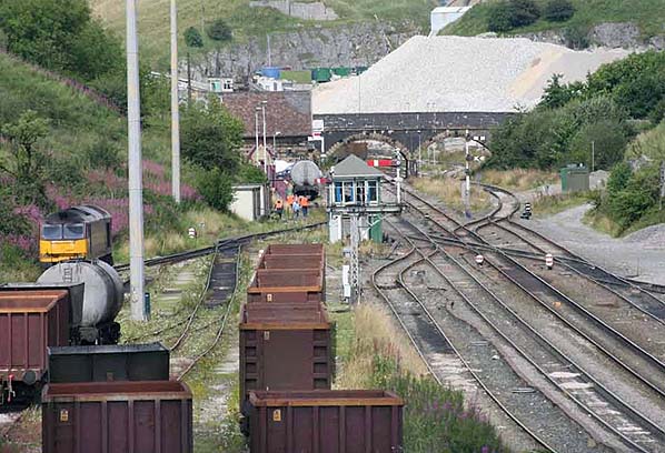 ![]() Peak Forest station in July 2006. The northbound station building is to the left of the signal box. The site of the southbound platform is indicated by a grassy mound between the running lines and the siding on the extreme right of the photos, just in front of the overbridge.