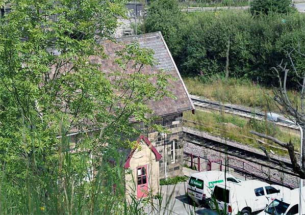 Peak Forest station in July 2006, the main station building seen from the rear. The grass between the tracks is the site of the southbound platform.