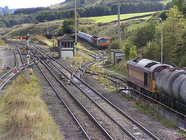 Looking south at the site of Peak Forest station in October 2009. The site of the southbound platform can clearly be seen as a grass mound to the left of the picture. The locomotive and oil tanks occupies part of the site of the northbound platform. As demonstrated by the picture Peak Forest remains a busy railway location but not for passenger services. Peak Forest South signal box is also seen.