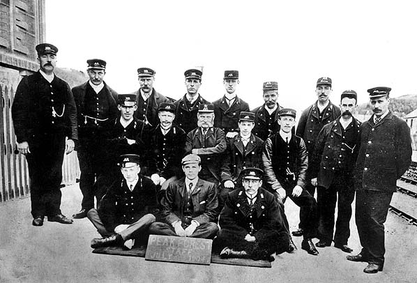 Station Master William Farrow and some of his staff in July 1904. William Farrow came to Peak Forest from SM Hugglescote in 1887, and retired around 1909.