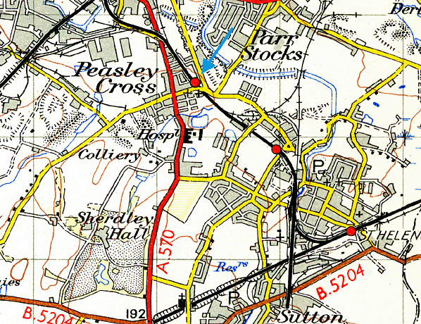 Notes: Peasley Cross Station was on the St. Helens and Runcorn