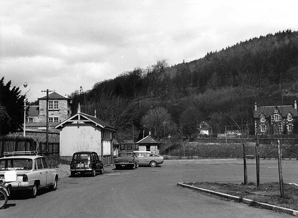 The three remaining railway buildings at Peebles in April 1977 are seen in the former goods yard. The goods office and weigh office in the foreground are still there. The third building has now gone.