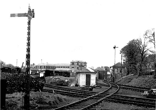 ![]() Peebles goods yard looking north-west c. 1950s. Peebles Junction signal box is seen on the right and to its left is the goods warehouse. The wide goods dock is seen behind the platelayers' hut.The line to the left leads to the Caledonain station. This was a goods station only after 5. June 1950. After that date it was only accessible from this direction, closing completely on 1 August 1959 Photo from Bill Lynn collection |