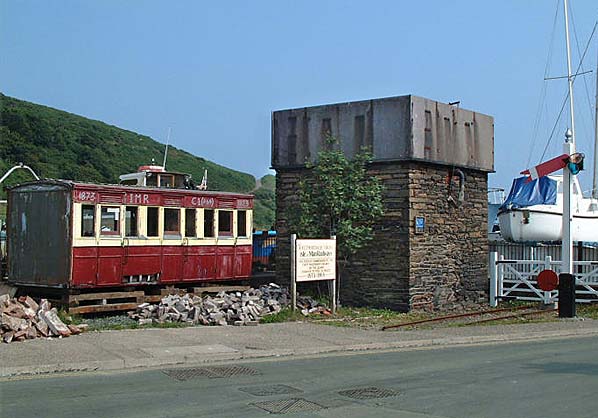Mill Road level crossing in June 2001. A short length of track has been retained together with an IMR coach to commemorate the Peel to Douglas line.