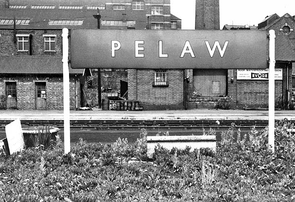 ![]() The BR(NE) double-sided running-in board at the west end of Pelaw (third) station. ‘Black-edged lettering’ used only by the North Eastern region was a feature both of the running-in board and totems at Pelaw. Staff have neglected the flower bed in the foreground; in October 1969, only three months after this photograph was taken, Pelaw was to become an unstaffed ‘Paytrain’ station.