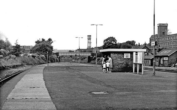 ![]() The ample size of the island platform contrasts with the mean brick shelter in this late 1970s westward view of Pelaw (third) station. The former CWS building has been taken over by Callers, but would later be demolished and a supermarket built on the site.