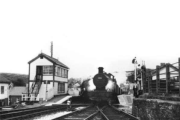 Pencader station looking north in July 1958. The cattle dock and pens are seen on the right. 2200 is about to pick up the single line token and is working a class K pick up freight. This loco is a 2251 class 0-6-0. Designed by C.B.Collett and built at Swindon works in 1938, it had a working life of just over 24 years when it was withdrawn from 82D, Westbury shed in September 1962 to be cut up by Cashmores of Newport in June 1964.