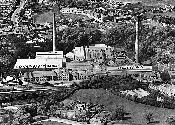 Valleyfield Mills c.1950s. Low Mill is seen bottom right. Penicuik station is seen on the left and on the extreme right is the bridge that takes the Low Mill siding under the Penicuik line and