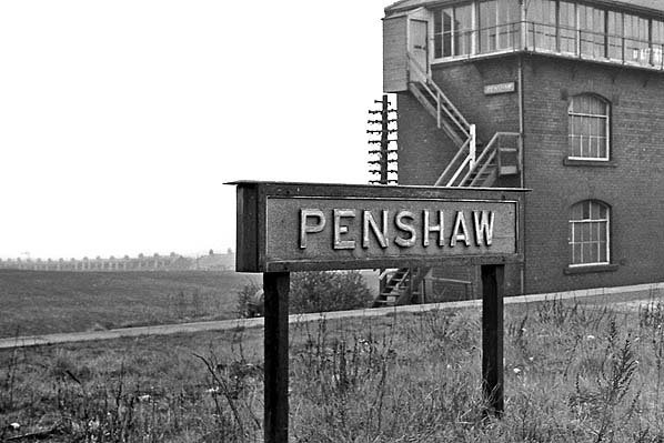 The LNER running-out nameboard on the down face of Penshaw second station’s island platform. The garden which formerly surrounded the nameboard has been abandoned. The station has been an ‘unstaffed halt’ since 1962, and would close in May 1964, the month after this photograph was taken.Photo by Charlie Verrall from his Flickr photostream